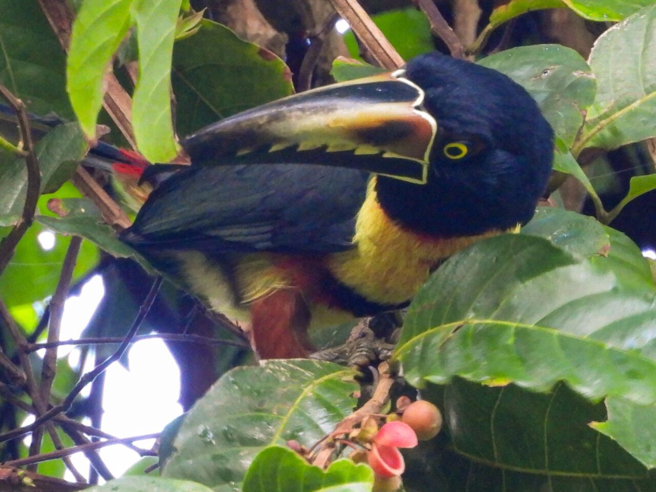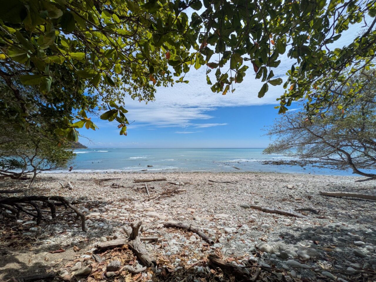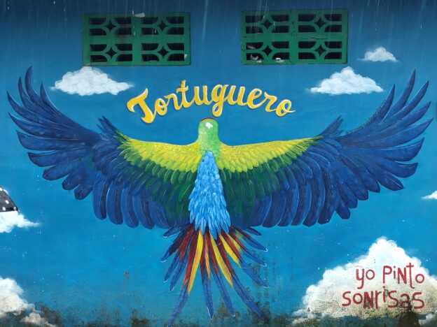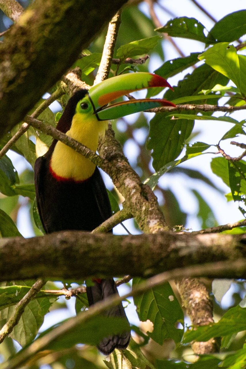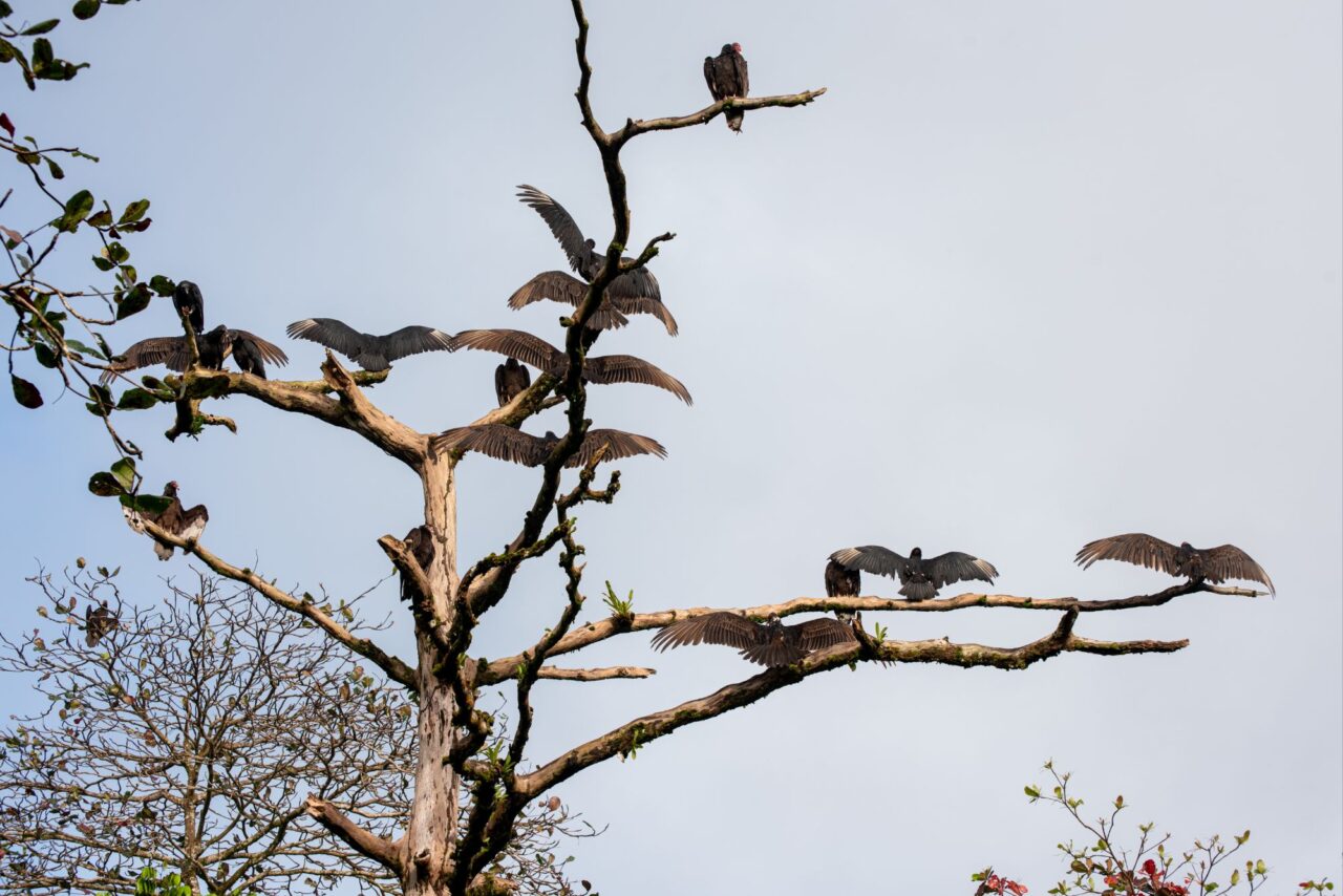 Wir tapern die Straße am Strand Playa Negra mit seinem schwarzen Sand entlang. Die Häuser haben viel Abstand und große Gärten, da sehen wir viele flattrige Federkleider. Ein Specht nimmt eine am Baum hängende Frucht aus. Eine Drossel, der Nationalvogel von Costa Rica, stöbert durch die Vorgärten. Ein Kolibri sammelt die Blüten einer großen Staude ab. Kiskadees bauen ein Nest oben auf nem Strommast. Tangare flirten im Gebüsch. Ein Habicht ruft vom Baum zu uns herab. Das übliche Geschnabel, Gesinge und Geflatter des Morgens, nur eben mit ganz anderen Vögeln. Echt schön!