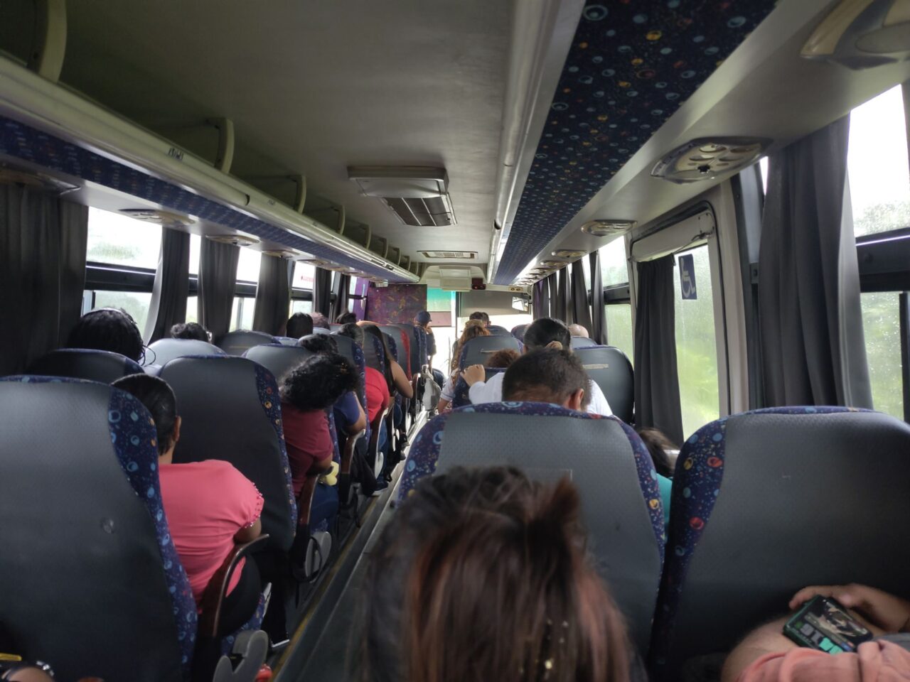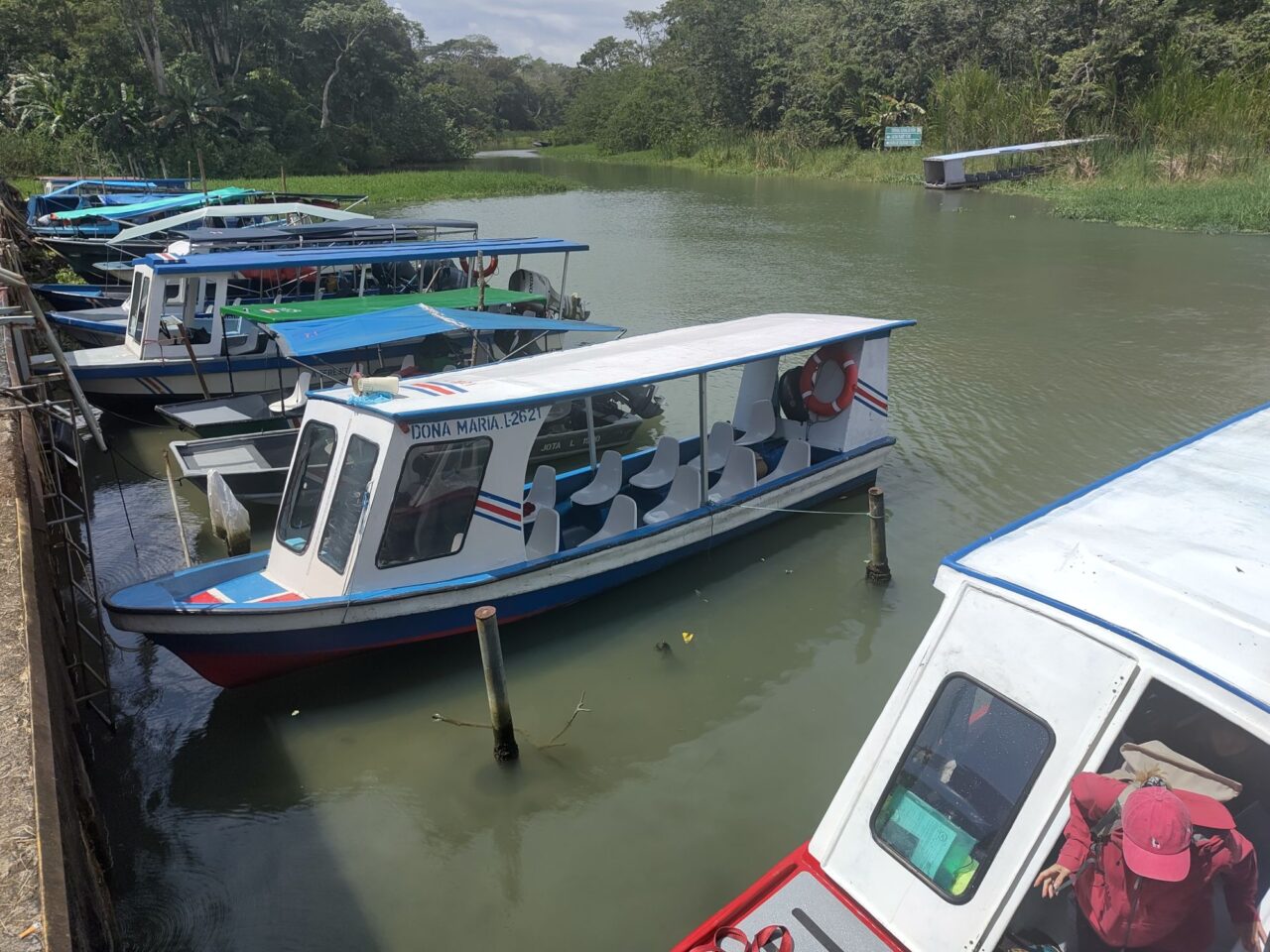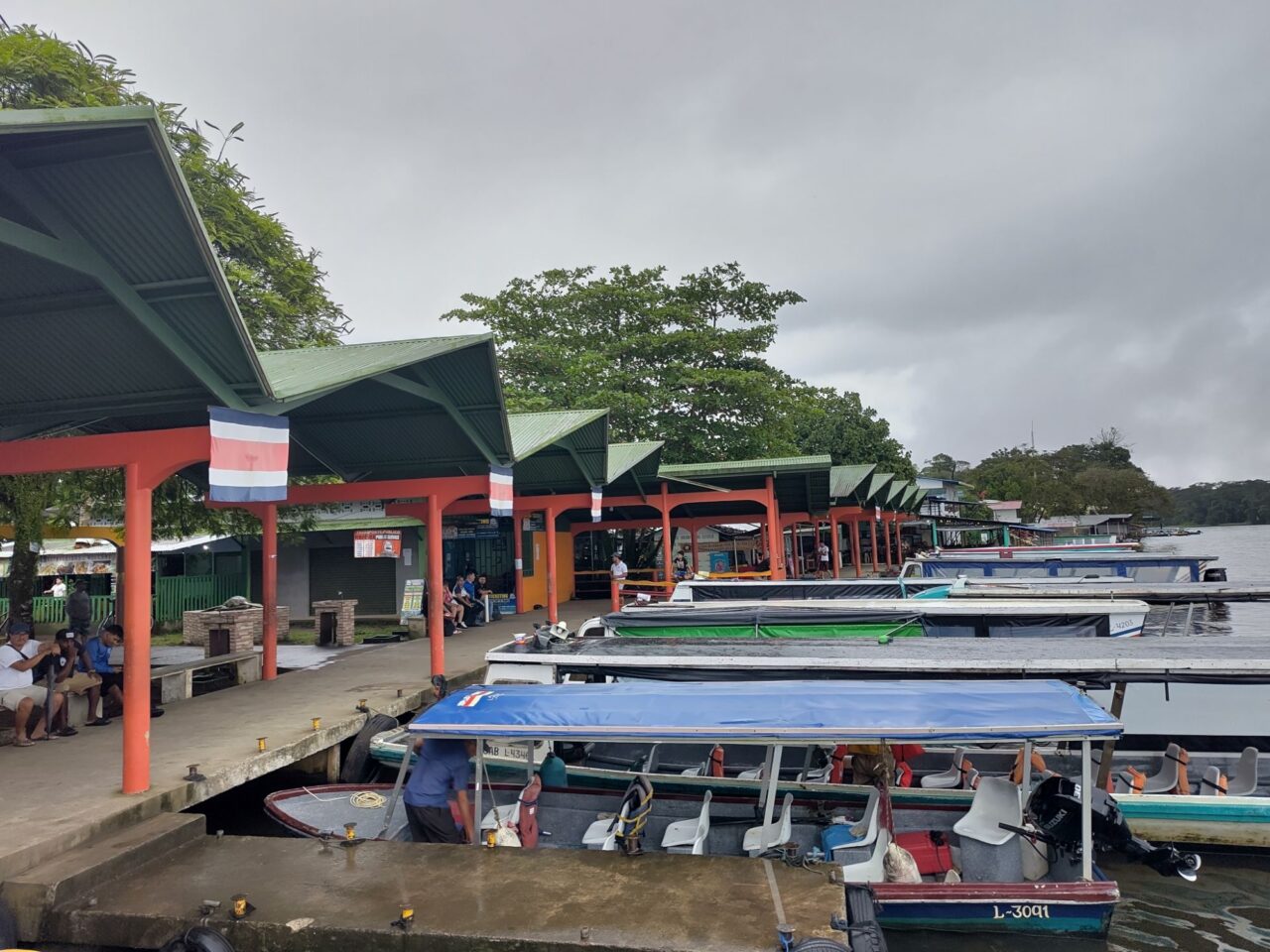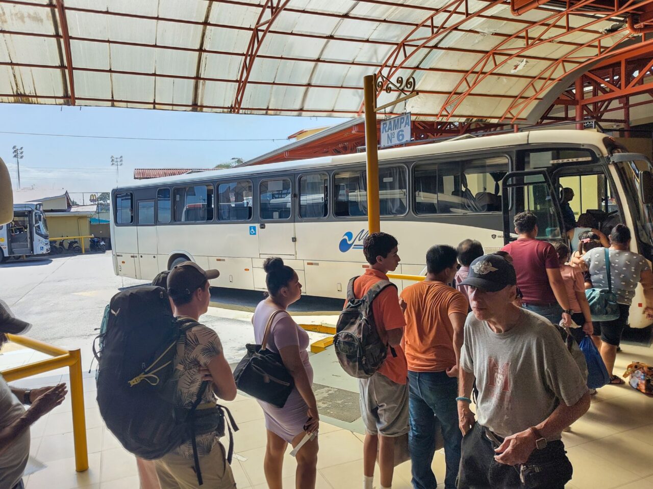 Das Busterminal ist nicht weit und recht klein, trotzdem gibt es 5 Gates mit klar beschilderten Linien. Wir unterhalten uns mit einem Tico, radebrechen auf Spanisch, eine Niederländerin unterstützt. Dann kommt der Bus, ein ordentlicher Reisebus mit Klimaanlage. Gut so, denn wir fahren 4,5 h bis San Jose. In Limon ein Zwischenstopp an einem größeren Terminal, dort kaufen wir eine Empanada, eine lecker gefüllte Teigtasche. Dann hupt der Bus bald, es geht weiter.