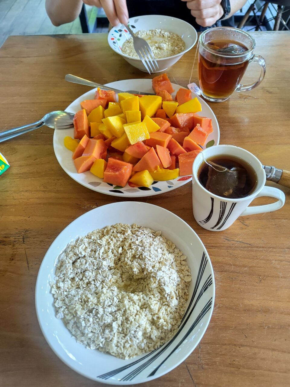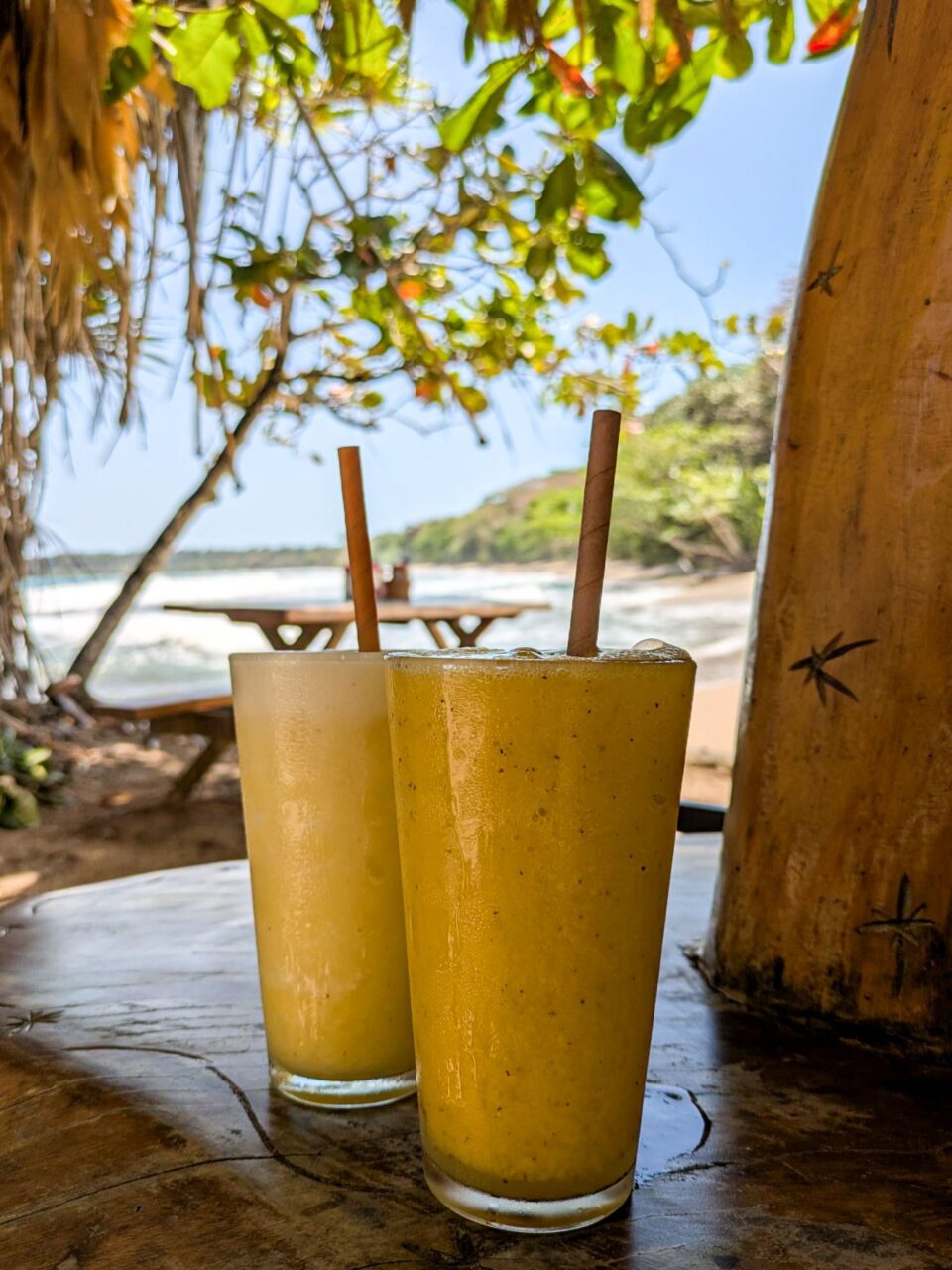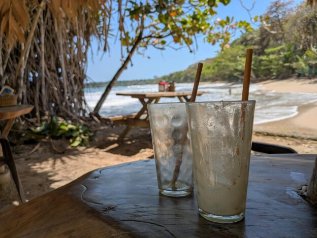 Anja schnippelt Mango und Papaya, und kocht Tee, ich düse zum großen Supermarkt und hole ein paar Haferflocken. In die kommt Osaft. Danach noch nen Kaffee, dann können wir packen gehen. Das ist in ein paar Minuten erledigt, so haben wir doch noch Zeit, bis wir um 11 raus sein müssen. Die Stunde bis zum Bus überbrücken wir mit einem letzten Batido (Anja Ananas, Uwe Maracuja) am Strand.